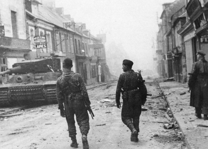 Two Leibstandarte Panzergrenadiers on the Rue Pasteur walk past Wittmann's disabled Tiger outside the Huet-Godefroy store.