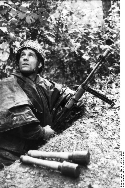 Dieses Foto zeigt einen deutschen Fallschirmjäger in Frankreich, Sommer 1944; FG 42 Gewehr und Modell 24 Granaten (Normandie Kampagnen). Bundesarchiv Bild 101I-738-0289-18; Foto Artur Grimm