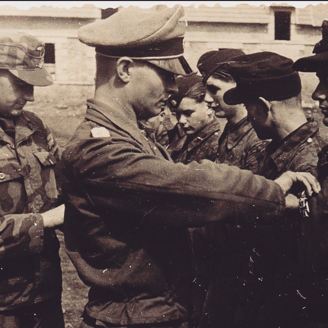 Ritterkreuzträger und Kommandeur der 12.SS-Panzerdivision "Hitlerjugend" Max Wünsche zeichnet junge Panzergrenadiere seines Regiments während der Schlacht um die Normandie (Invasionsfront) im Sommer 1944 aus. Hinter ihm steht Adjutant Georg Isecke. Der so eben ausgezeichnete Typ ist SS-Sturmmann Klein.